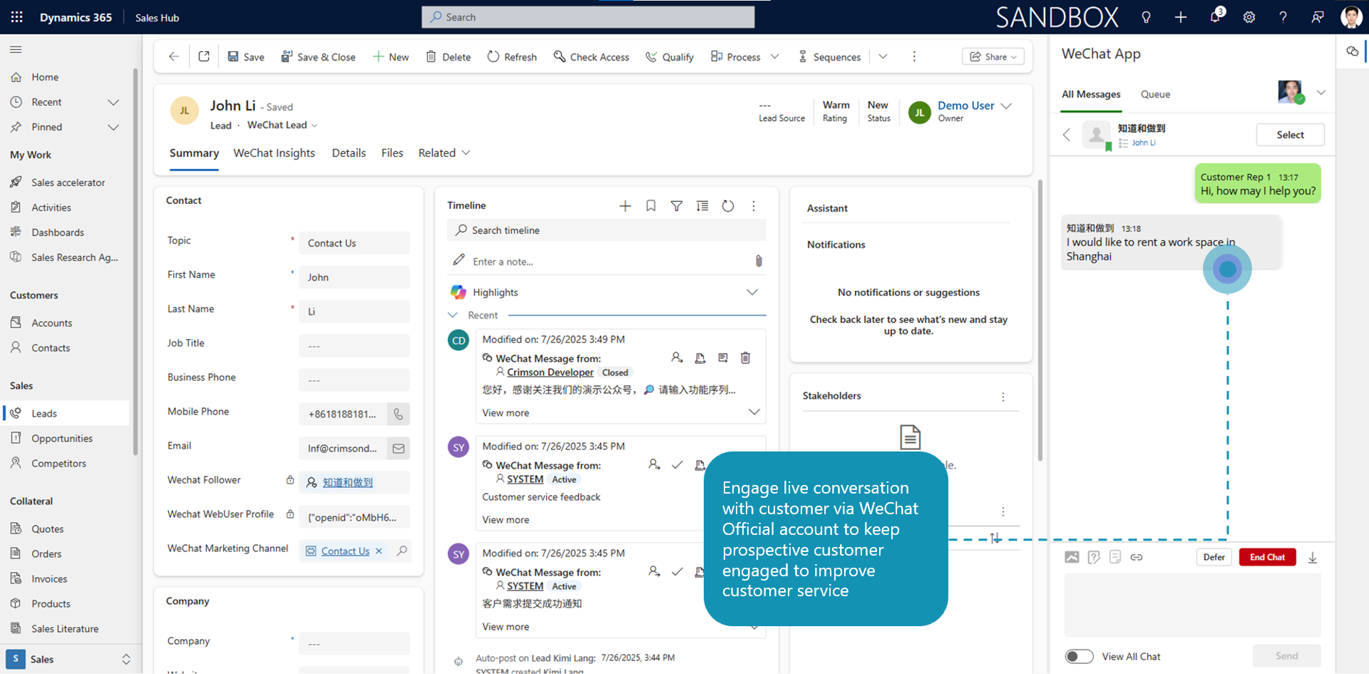 Engagement via WeCom app – Allow CS users to engage with customers whom they have added as WeCom contact.